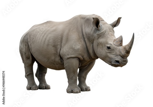 A southern white rhinoceros stands facing right on a white background, showcasing its thick skin and horns