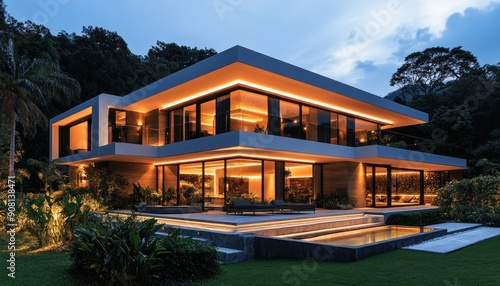 A spacious and contemporary house that features numerous windows is beautifully lit up at night