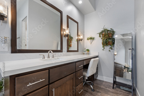 A spacious bathroom that features two sinks, two mirrors, and a desk
