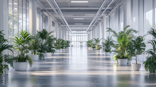 A spacious, bright office hallway lined with lush green plants in white pots, showcasing minimalistic and modern interior design with natural light
