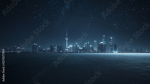 A spacious car plaza with a skyline beneath a vast starry night sky. Featuring contrast and stillness