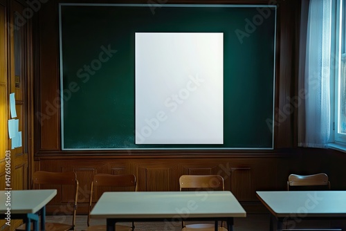A spacious classroom featuring empty desks and chairs. with a large blank window frame on the green chalkboard wall. illuminated by natural light streaming in from the windows