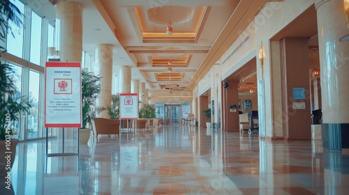 A spacious hotel lobby with elegant design and informational signage.