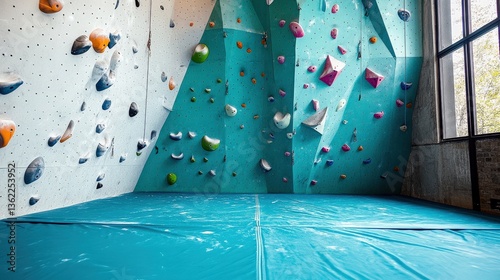 A spacious indoor bouldering gym features vibrant climbing holds against a geometric wall design, representing fitness, adventure, and community in climbing culture.