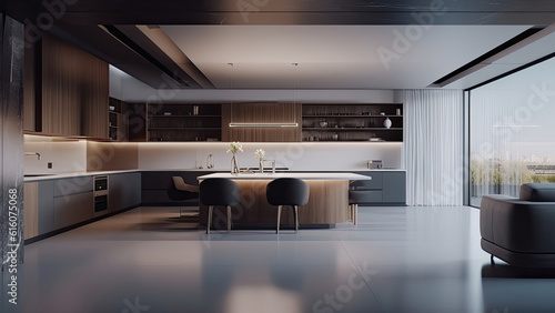 A spacious kitchen featuring a modern design with a harmonious blend of white, gray, wood, and marble elements. Photorealistic illustration, Generative AI