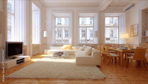 A spacious, light-filled living area with a large dining room, showcasing a modern interior design.