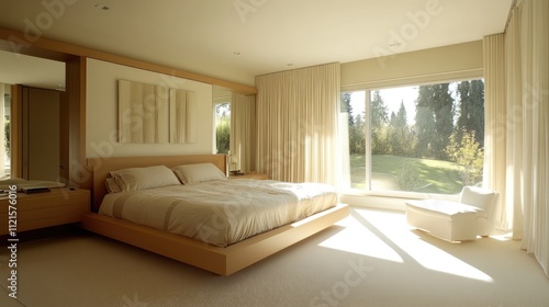 A spacious minimalist bedroom with a low wooden bed, light beige bedding, and minimalist furniture, complemented by natural light and neutral walls