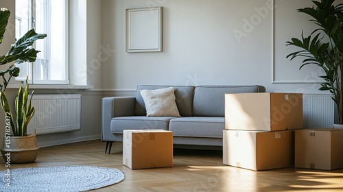 A spacious, modern apartment with stacked moving boxes, a cozy sofa, and minimalistic decor