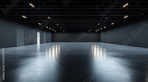 A spacious, modern interior featuring polished floors and minimalist lighting, creating an open and versatile environment.