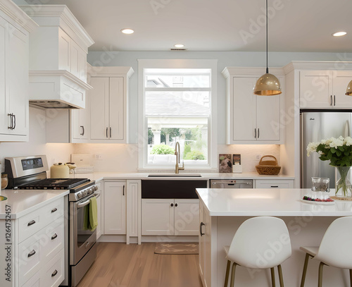 A spacious modern kitchen with white cabinets, stainless steel appliances, and an island with barstools, illuminated by natural light. Generative AI