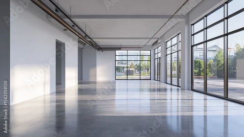 A spacious, modern office space with large windows, concrete floors, and a clean, minimalist design.