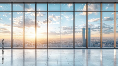 A spacious office window overlooking a metropolitan cityscape at sunset