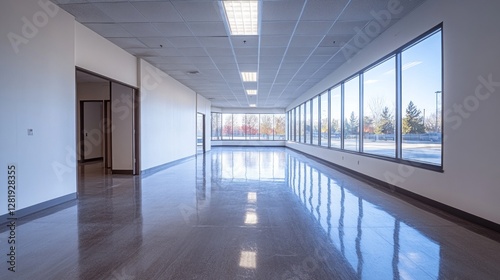 A spacious room features wide windows allowing abundant sunlight, reflecting on polished floors. Its white walls create a serene atmosphere for various activities or design.