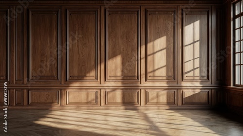 A spacious room featuring elegant wooden walls, bathed in warm light and shadow from large windows, creating a cozy atmosphere.