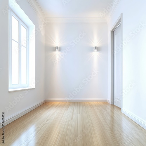 A spacious room with sleek interior design, a floor-to-ceiling window framing city views, stylish furniture, and accent walls adding warmth and character to the space