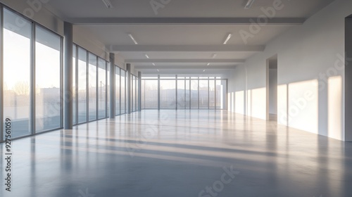 A spacious, sunlit empty office interior with large windows casting shadows on a shiny floor at sunset or sunrise, creating a serene atmosphere.