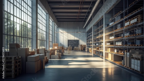 A spacious warehouse filled with boxes and shelves, featuring large windows that let in natural light, creating an inviting and organized atmosphere.