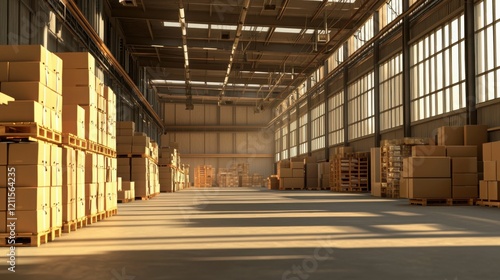 A spacious warehouse filled with neatly stacked boxes, illuminated by natural light filtering through large windows.