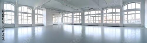 A spacious, well-lit interior with large windows, ideal for events or creative workspaces.