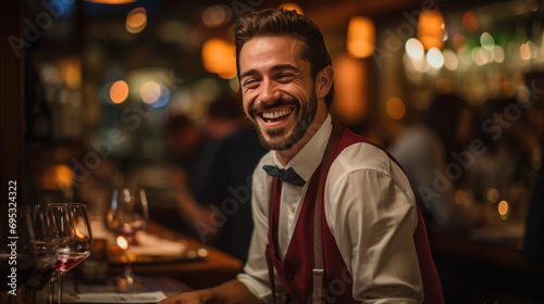 A Spanish waiter smiles as he pours red wine to a customer.
