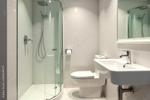 A sparkling clean bathroom, gleaming surfaces, freshly wiped down shower, spotless toilet, pristine sink, ready for use Perfect hygiene and cleanliness shown in detail , shower, sanitary