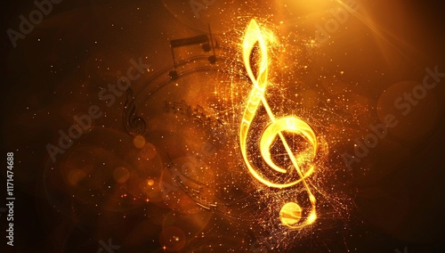 A sparkling golden treble clef shines brightly against a dark background, symbolizing the magic and energy of music.