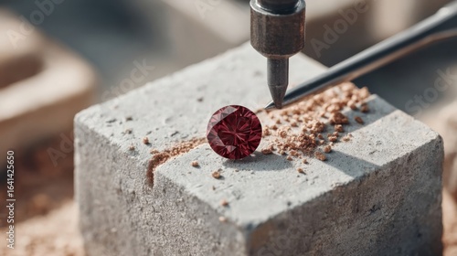 A sparkling red gemstone is positioned on a concrete block, with a tool nearby for precision work.