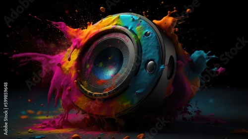 A speaker on a black background with a splash of colorful bright paint. Abstraction. AI generated