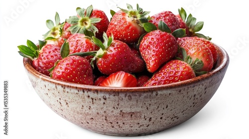A speckled bowl filled with ripe red strawberries complete with green stems sits against a white background