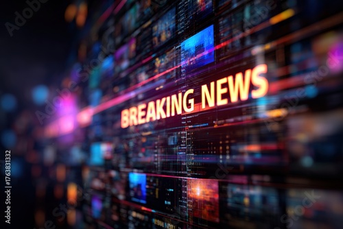A spectacular three-dimensional display of "Breaking News" in red light on a digital screen filled with video tiles and information graphics, symbolizing urgency, global events and a rapid media flow