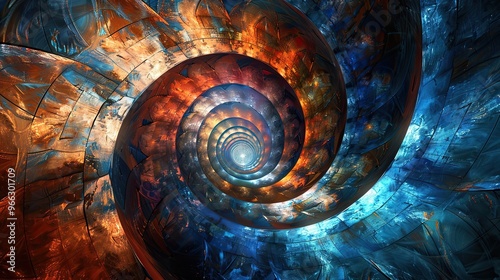 A spiral of blue and orange colors with a bright light shining on it