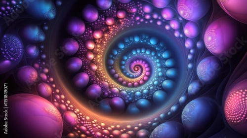 A spiral of radiant spheres glowing with gradient hues of purple, pink, and cyan, creating a hypnotic effect as they move outward into darkness