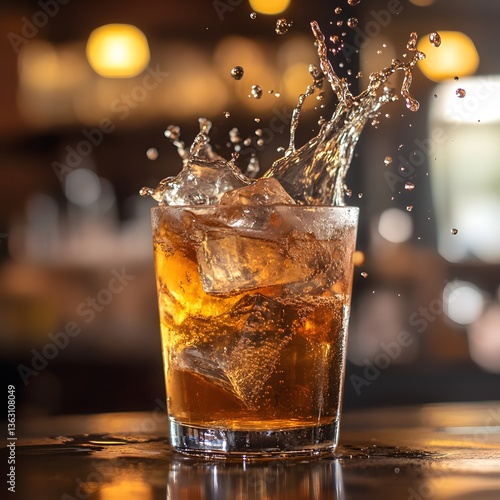 A Splash of Refreshment: A close-up view of a refreshing drink, ice cubes creating a dynamic splash within the crystal-clear glass, evoking a sense of cool relaxation.