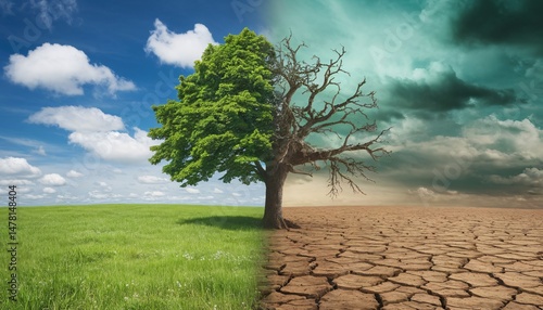A split image showing a vibrant tree in a green meadow juxtaposed with a barren landscape, symbolizing climate change.
