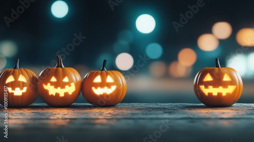 A spooky fog-covered village with pumpkins glowing in the windows of old cottages