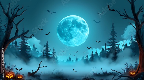 A spooky full moon night scene in paper craft style, with bats fluttering past a glowing moon, framed by twisted, gnarled trees, and a fog-covered forest floor, soft shadows adding depth,