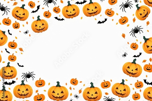 A spooky Halloween pumpkin frame featuring a set of carved pumpkins with scary faces, in an orange and black background