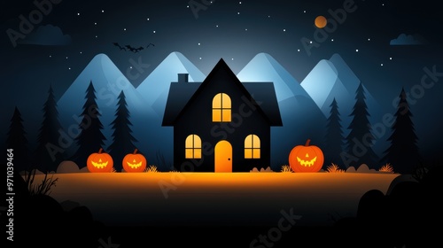 A spooky Halloween scene featuring a haunted house, glowing pumpkins, and eerie mountains under a starry night sky.