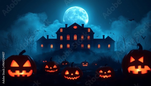 A spooky Halloween scene featuring glowing pumpkins in front of an eerie mansion under a full moon, perfect for seasonal visuals.