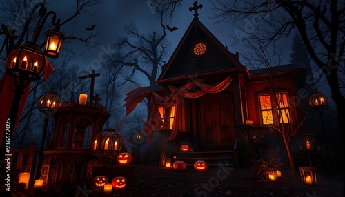 A spooky Halloween scene with a haunted house, glowing jack-o-lanterns, and lanterns.