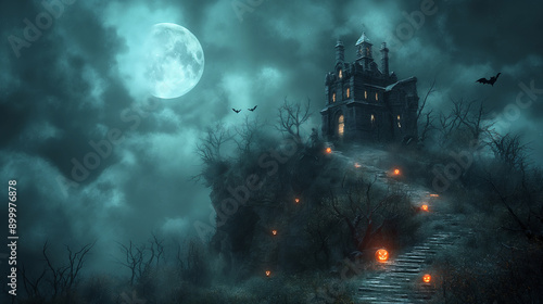 A spooky haunted house on a hill surrounded by a foggy landscape and full moon in a scary atmosphere for trick or treaters on Halloween night