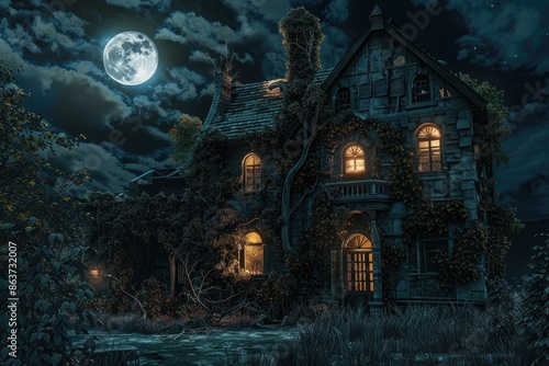 A spooky haunted house with broken windows, overgrown vines, and glowing lights inside, set against a backdrop of a full moon and a cloudy night sky