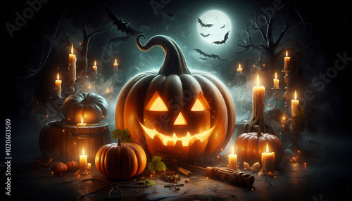 A spooky jack-o'-lantern scene illuminated by candles under a full moon, with bats flying in the eerie night