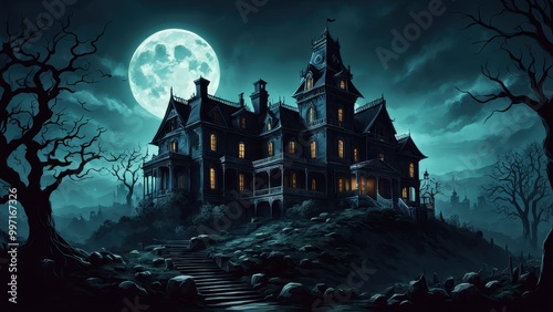 A spooky mansion illuminated under a full moon, surrounded by dark trees and rocky terrain.