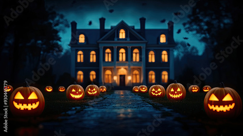 A spooky mansion surrounded by glowing jack-o'-lanterns under a dark, starry sky, perfect for Halloween-themed visuals.