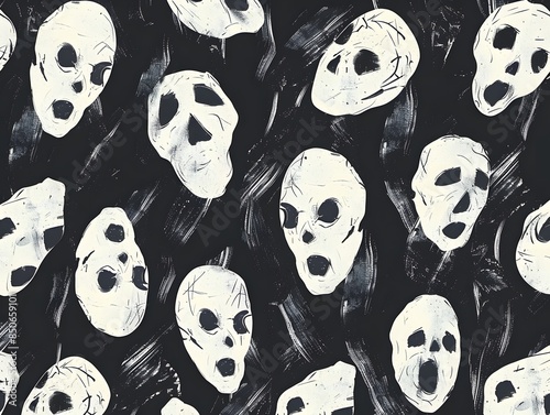 A spooky pattern of white screaming skulls on a black background with white brushstrokes.