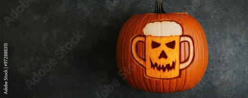 A spooky pumpkin carving with a beer mug design, pumpkin carving, beer mug, spooky