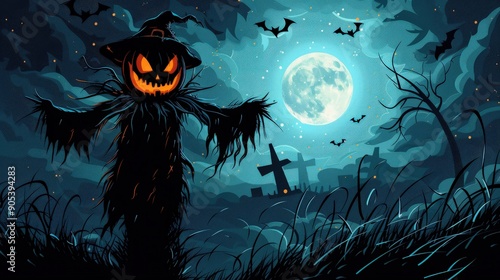 A spooky scarecrow with glowing eyes stands in a graveyard under a full moon, surrounded by bats.