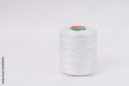 A spool of white braided fiberglass thread with a green core, isolated on a white background. Industrial material concept with copy space.