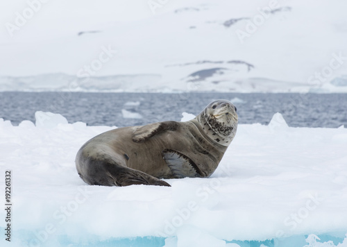 A spotted leopard seal laying on an iceberg. The gray water of the Southern Ocean and a mountain with a glacier are in the background.